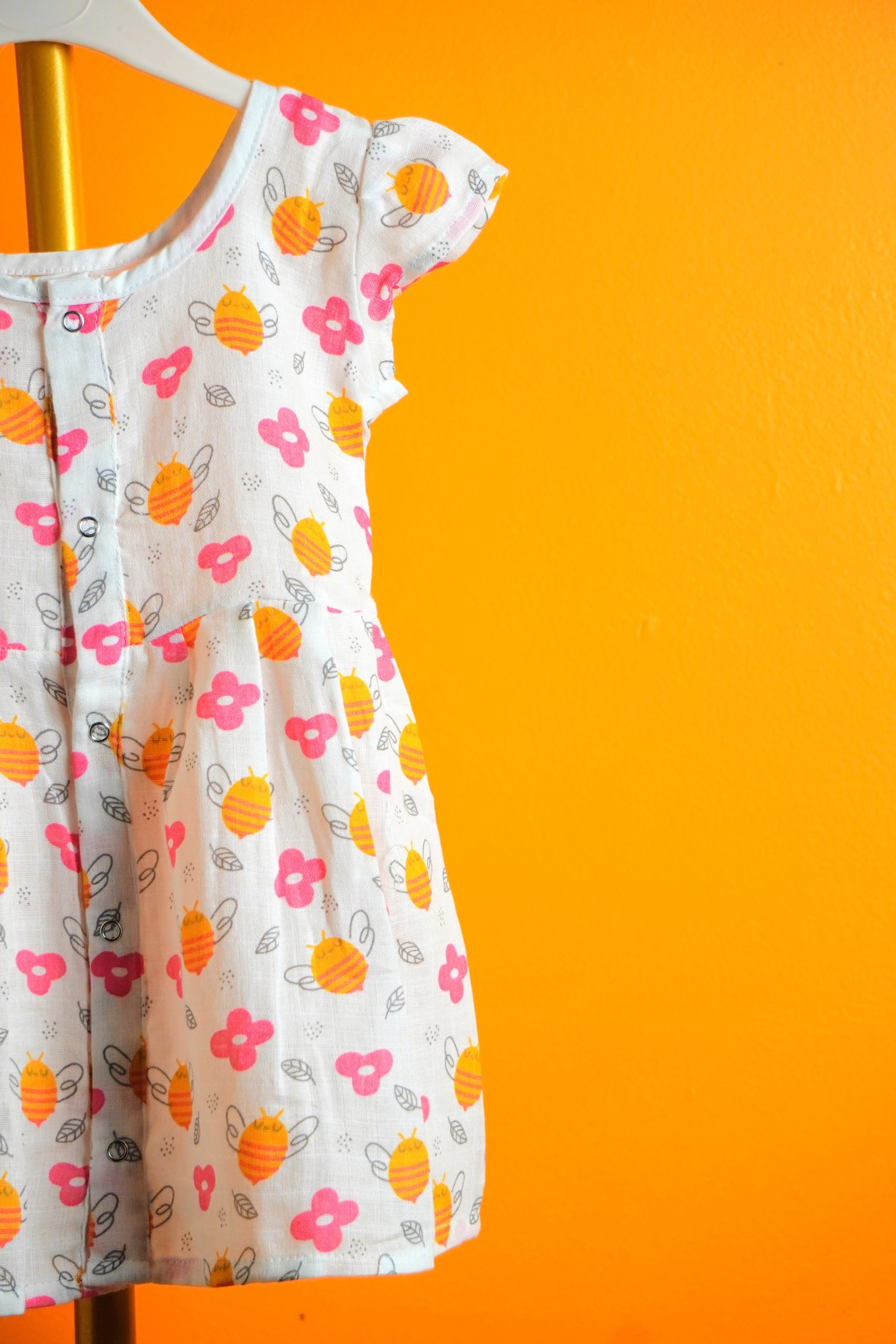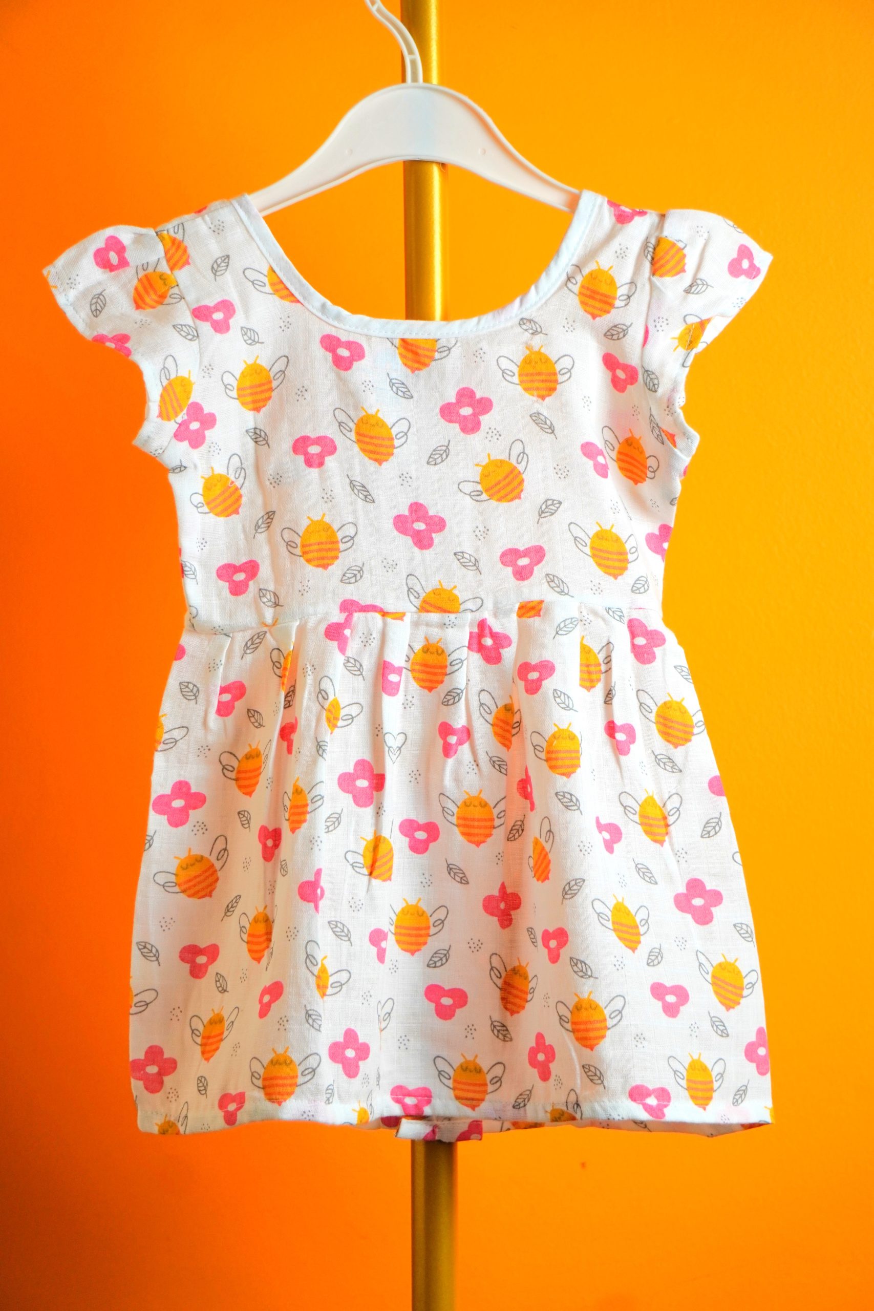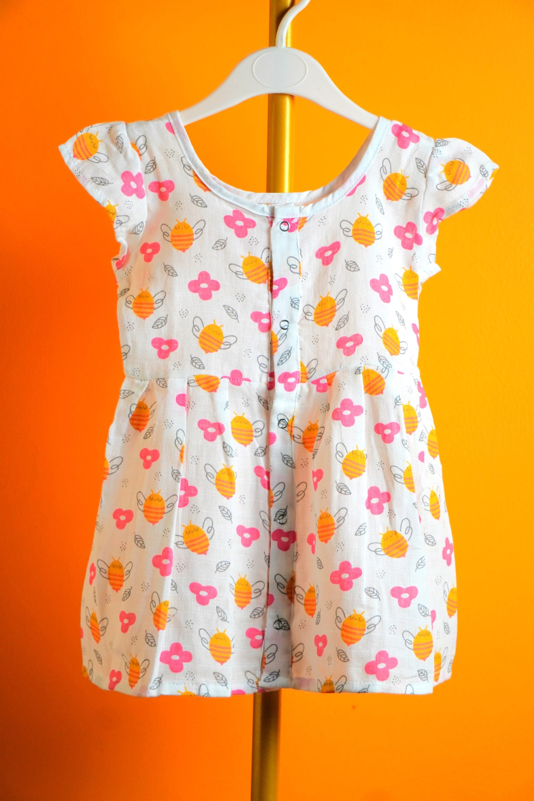 Let your little one shine in this joyful garden-inspired dress, where bees buzz and flowers bloom across a soft white canvas. Designed with fluttery ruffle sleeves and a gently gathered waist, itās made for twirls, giggles, and sunny adventures. The front button placket adds charm and ease, while the vibrant printāfeaturing orange bees, pink blossoms, and leafy greensāsparks imagination and delight.