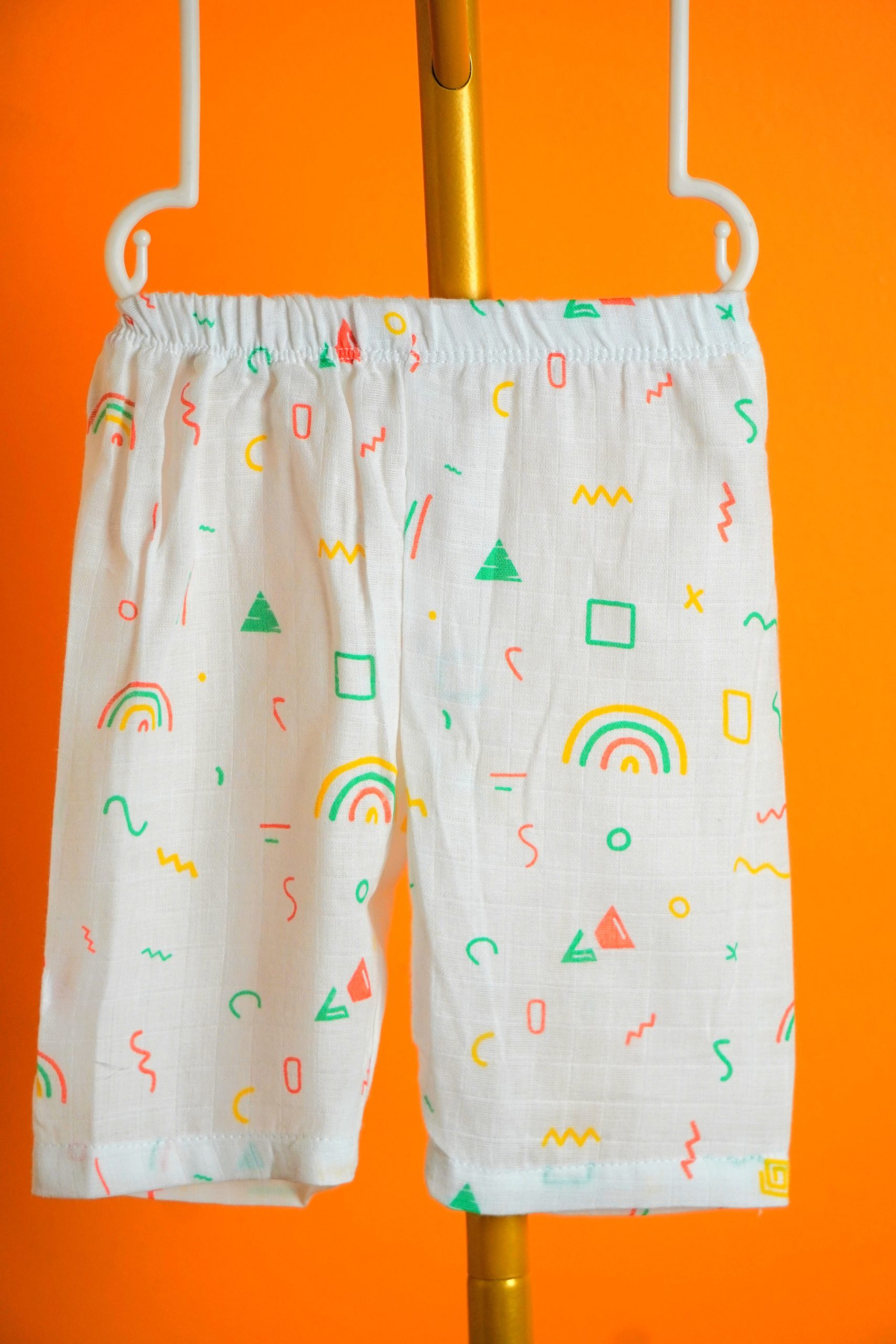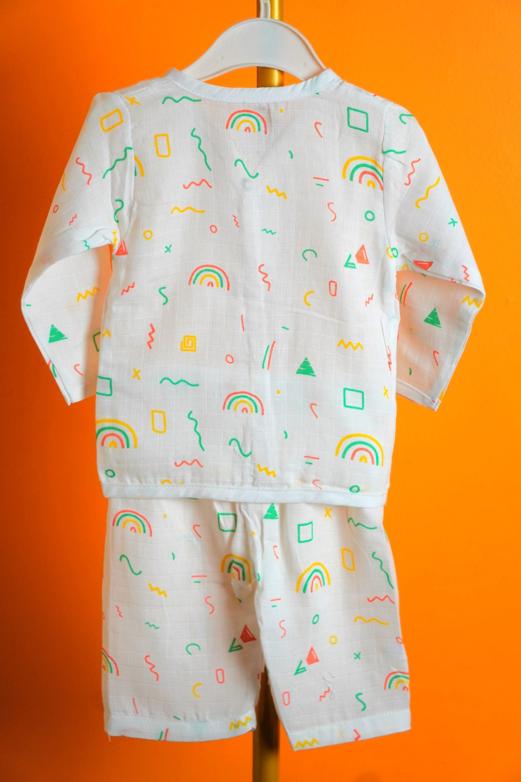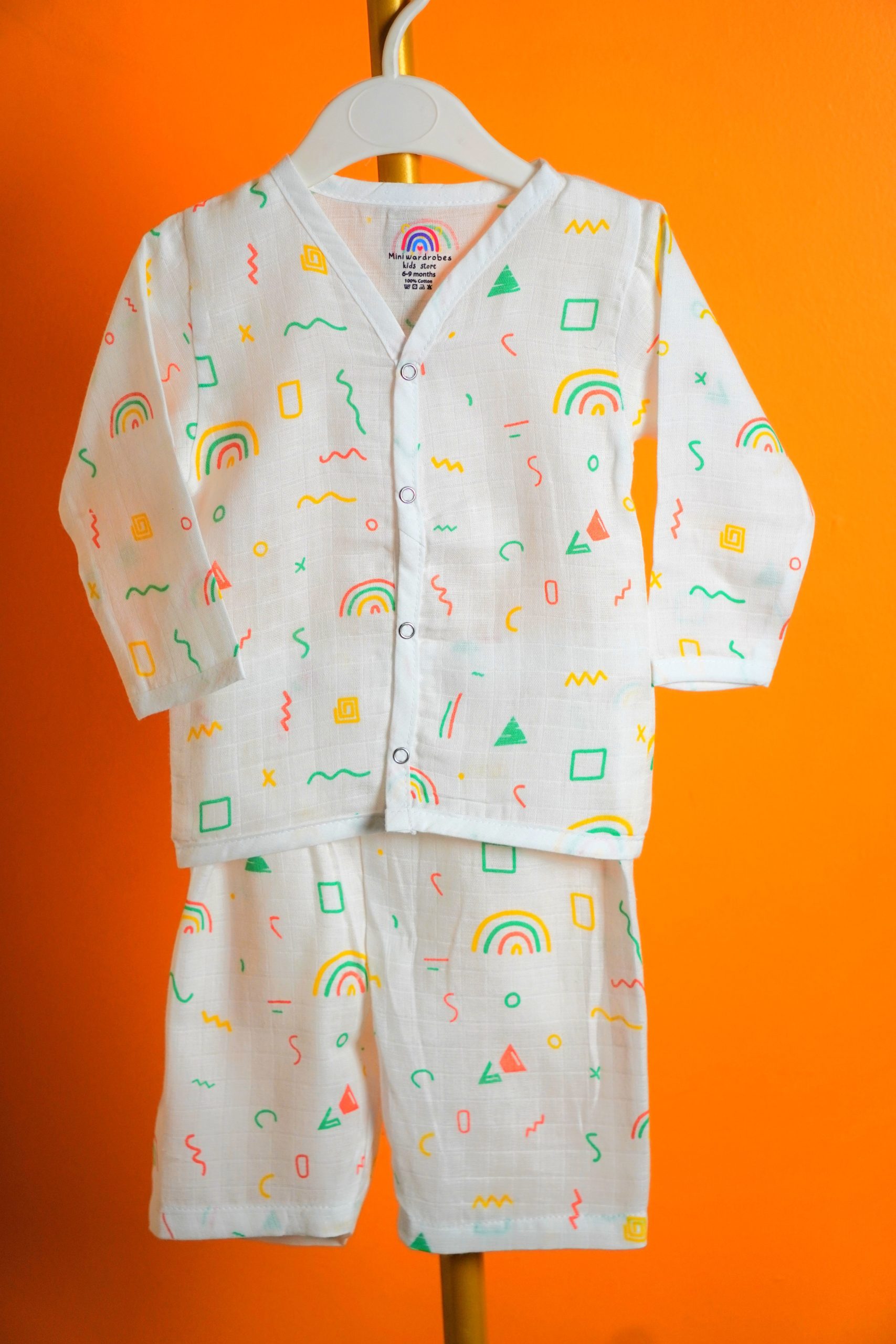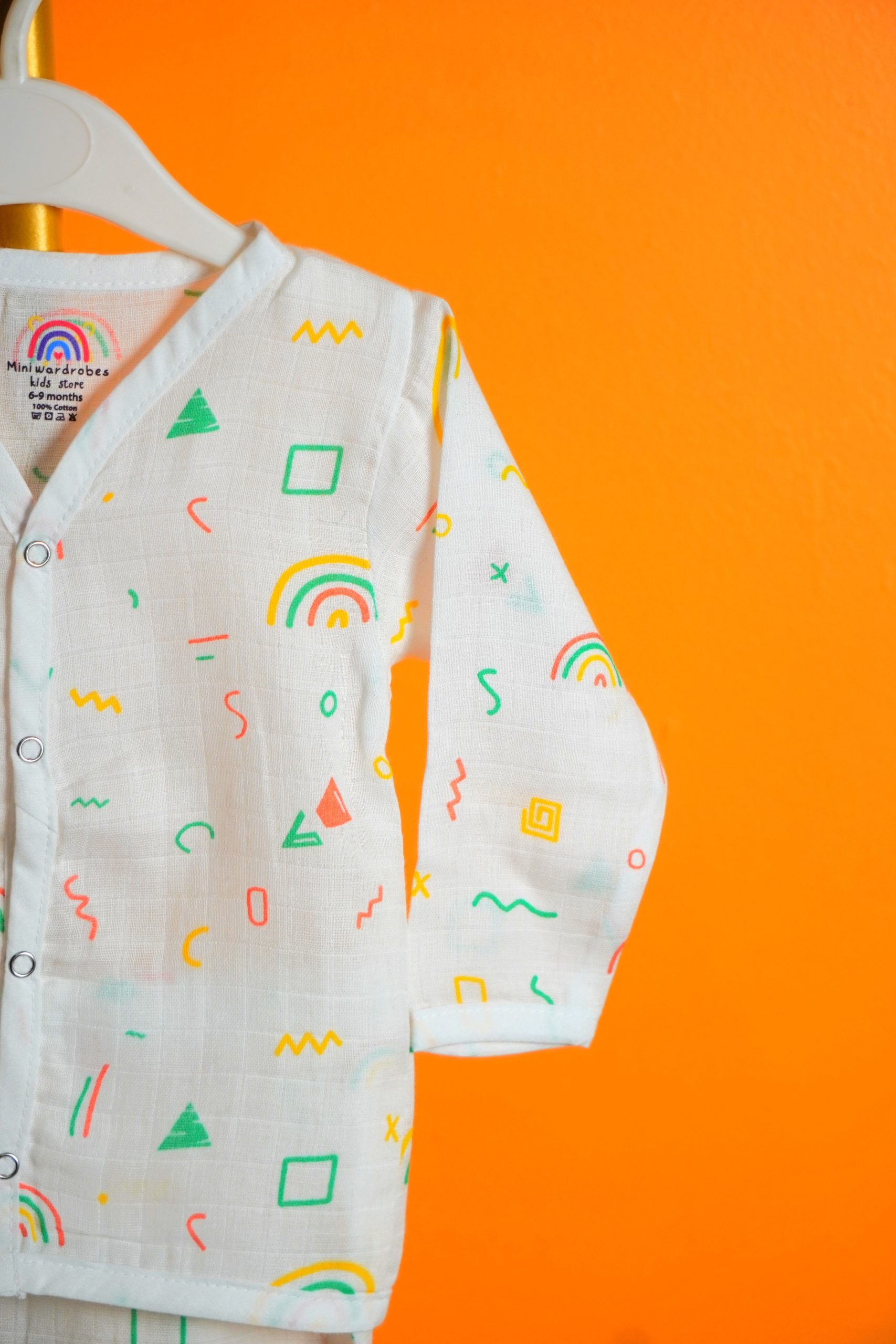 Brighten up your little one’s wardrobe with this vibrant two-piece outfit from Little Rainbow. Designed for comfort and creativity, this set features a soft, long-sleeved button-up shirt and matching shorts, both adorned with a joyful mix of rainbows, squiggles, and geometric shapes in red, green, and yellow.