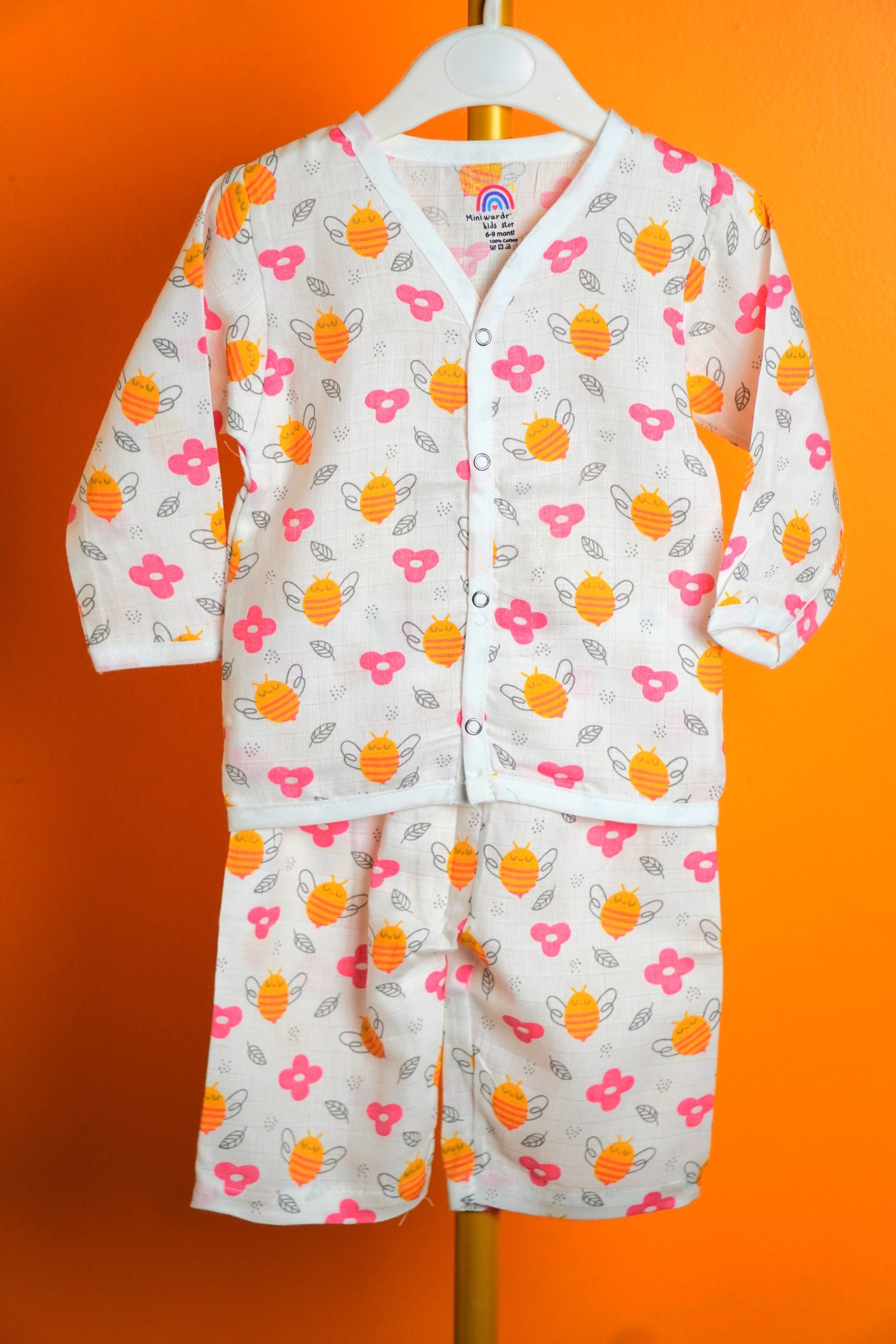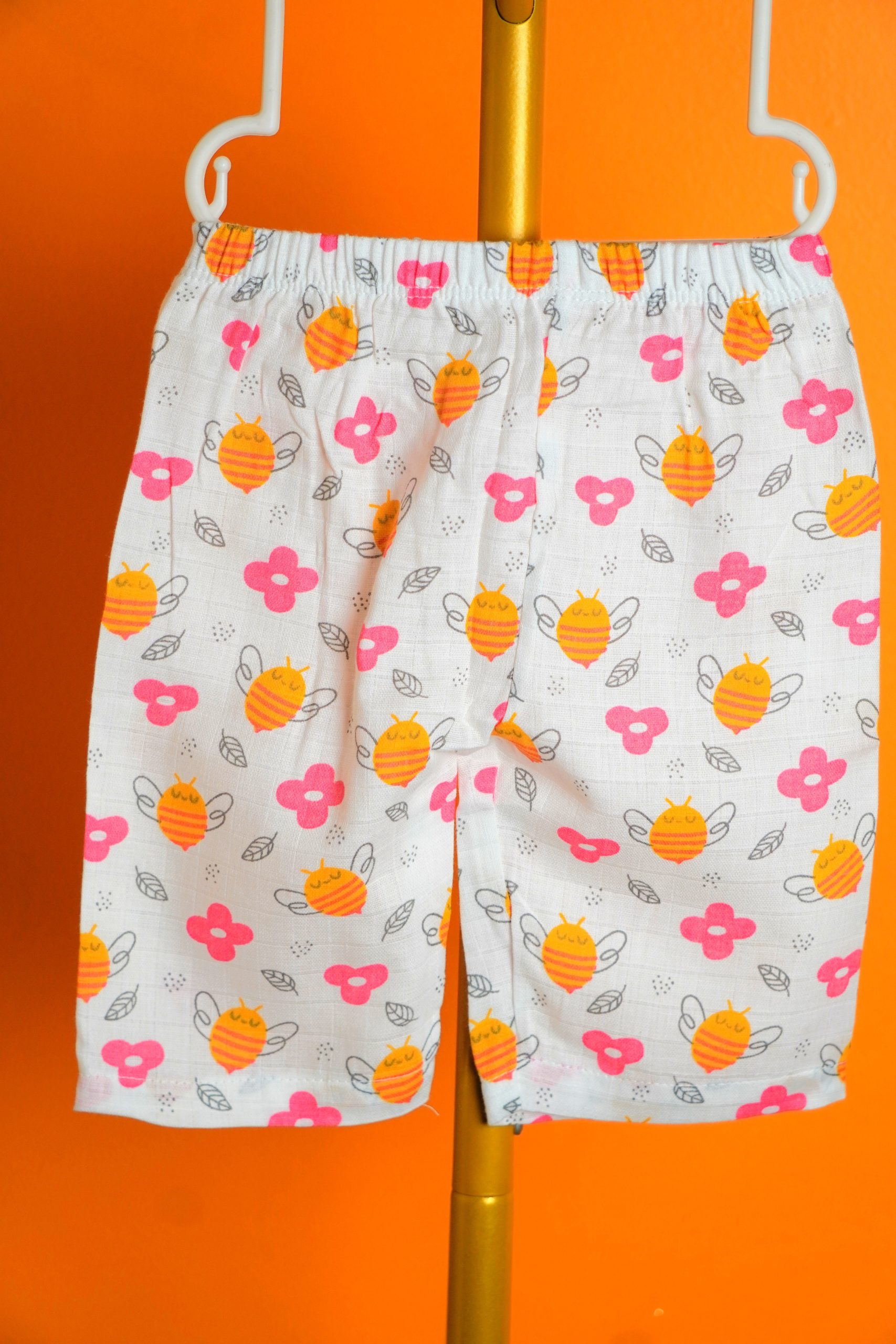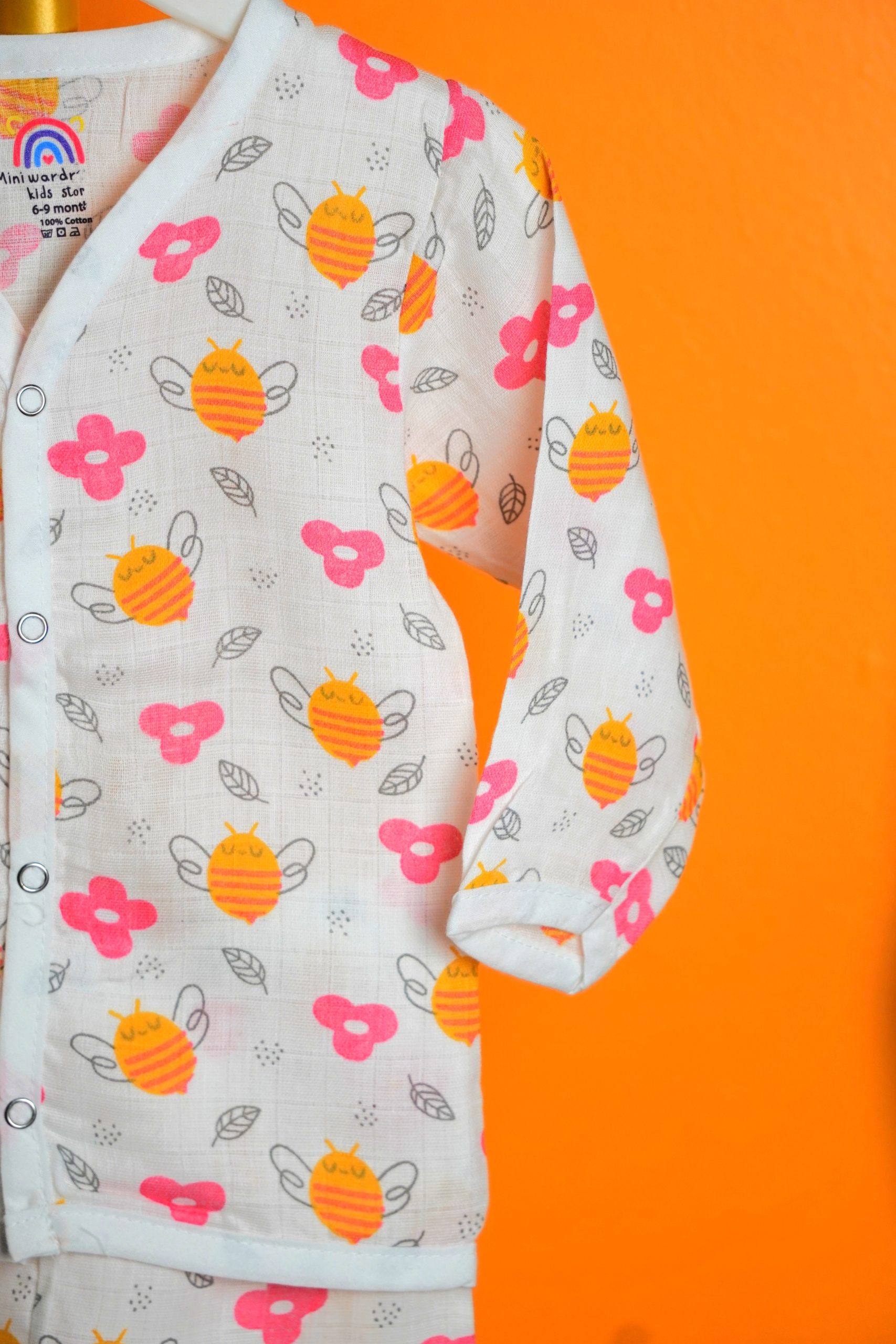 Let your little one shine in this cheerful two-piece set featuring a button-up shirt and matching shorts. Designed with a soft, breathable fabric perfect for warm days, the white base is brought to life with a whimsical print of buzzing orange bees, pink blossoms, and gentle grey leaves.