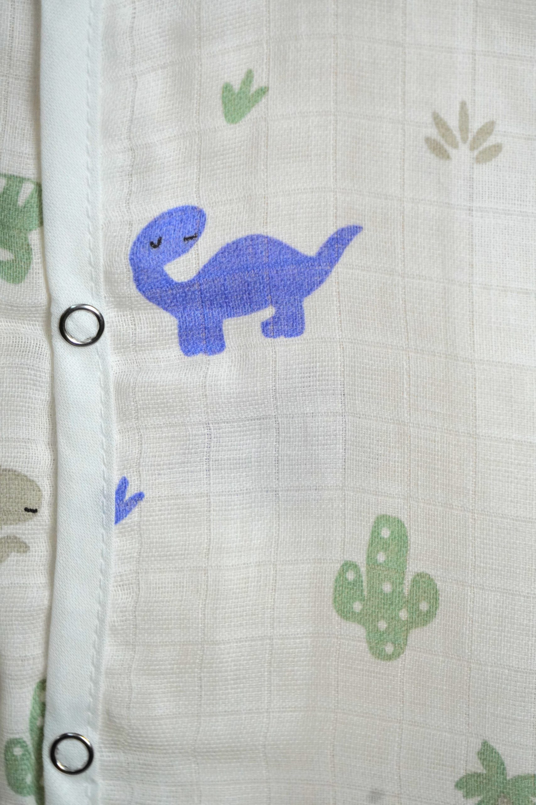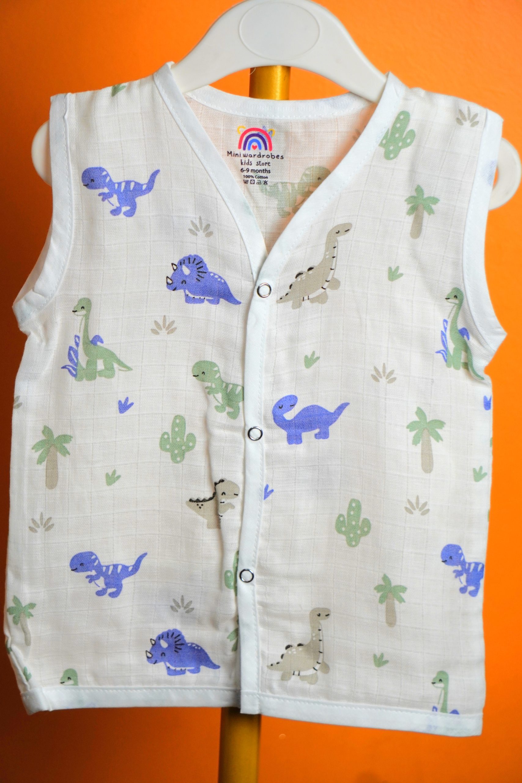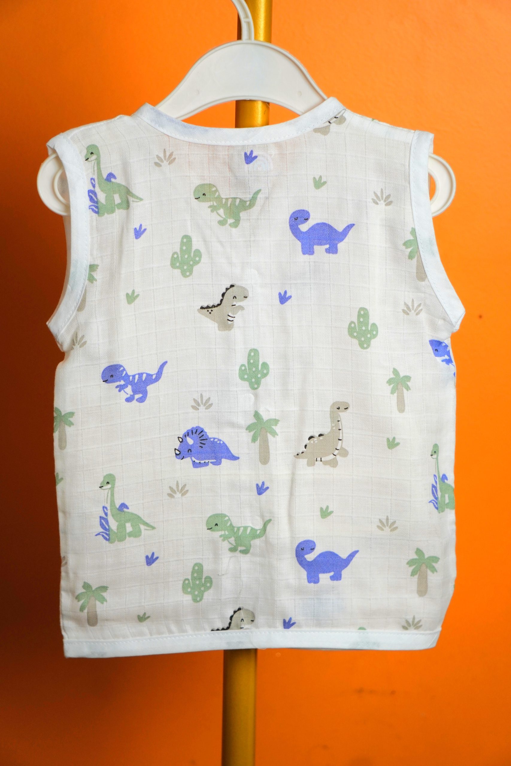 Let your little explorer roam in style with our Dino Days Sleeveless Vest. Crafted from soft, breathable cotton with a subtle grid texture, this vest features a parade of cheerful dinosaurs in blues, greens, purples, and sandy tones—each one ready for adventure. The V-neck cut and easy snap-button front make dressing a breeze, while the whimsical tree and plant illustrations add a touch of nature-inspired charm.