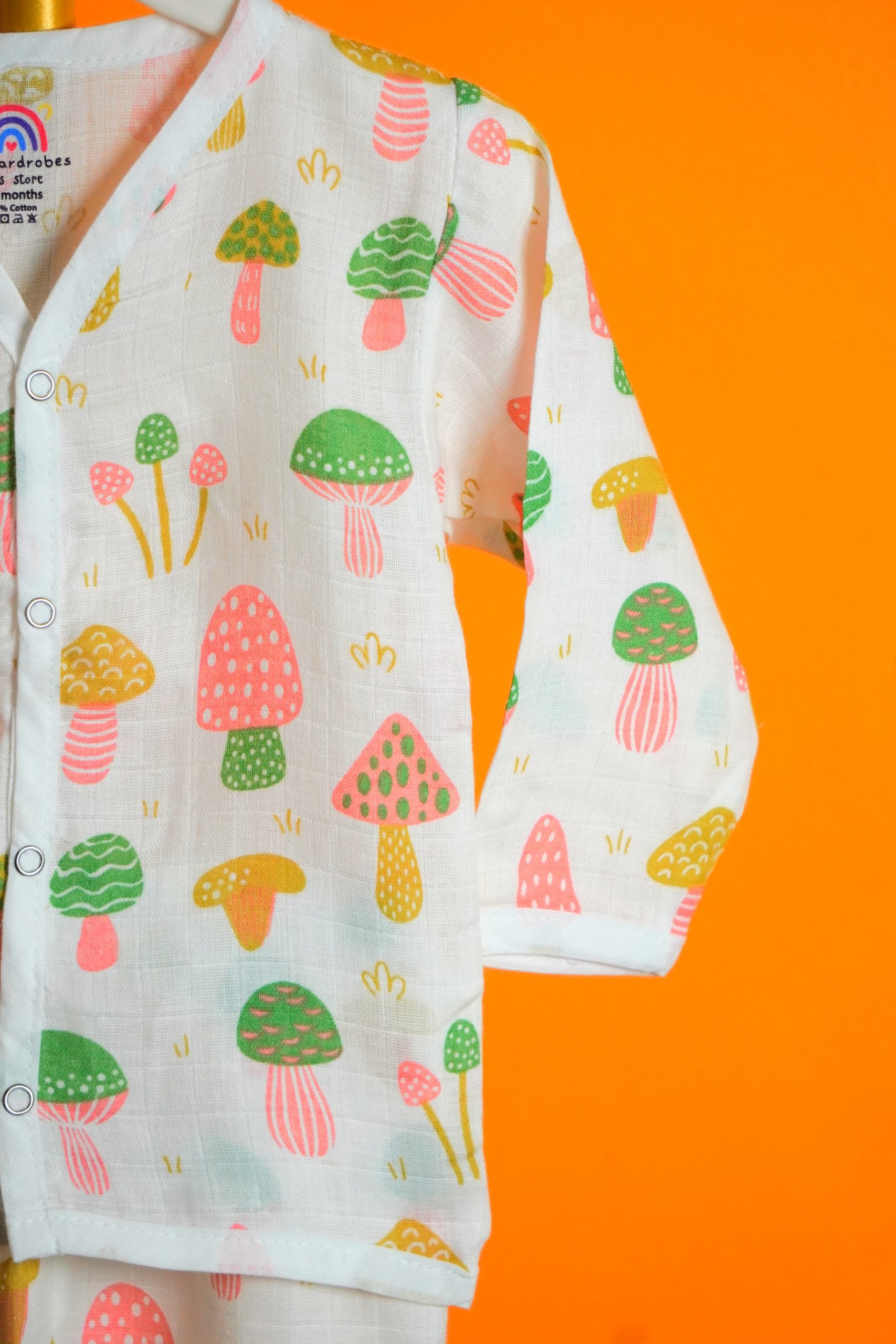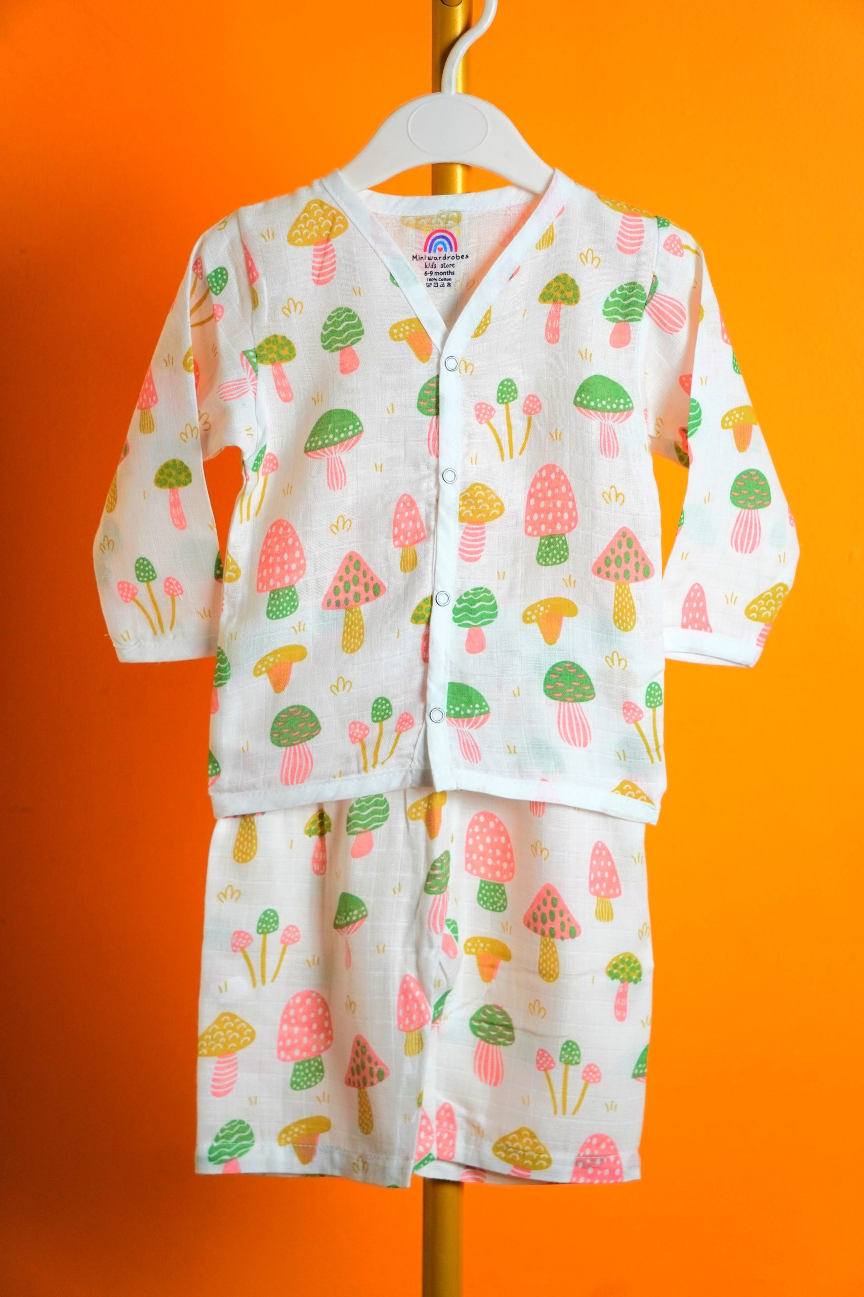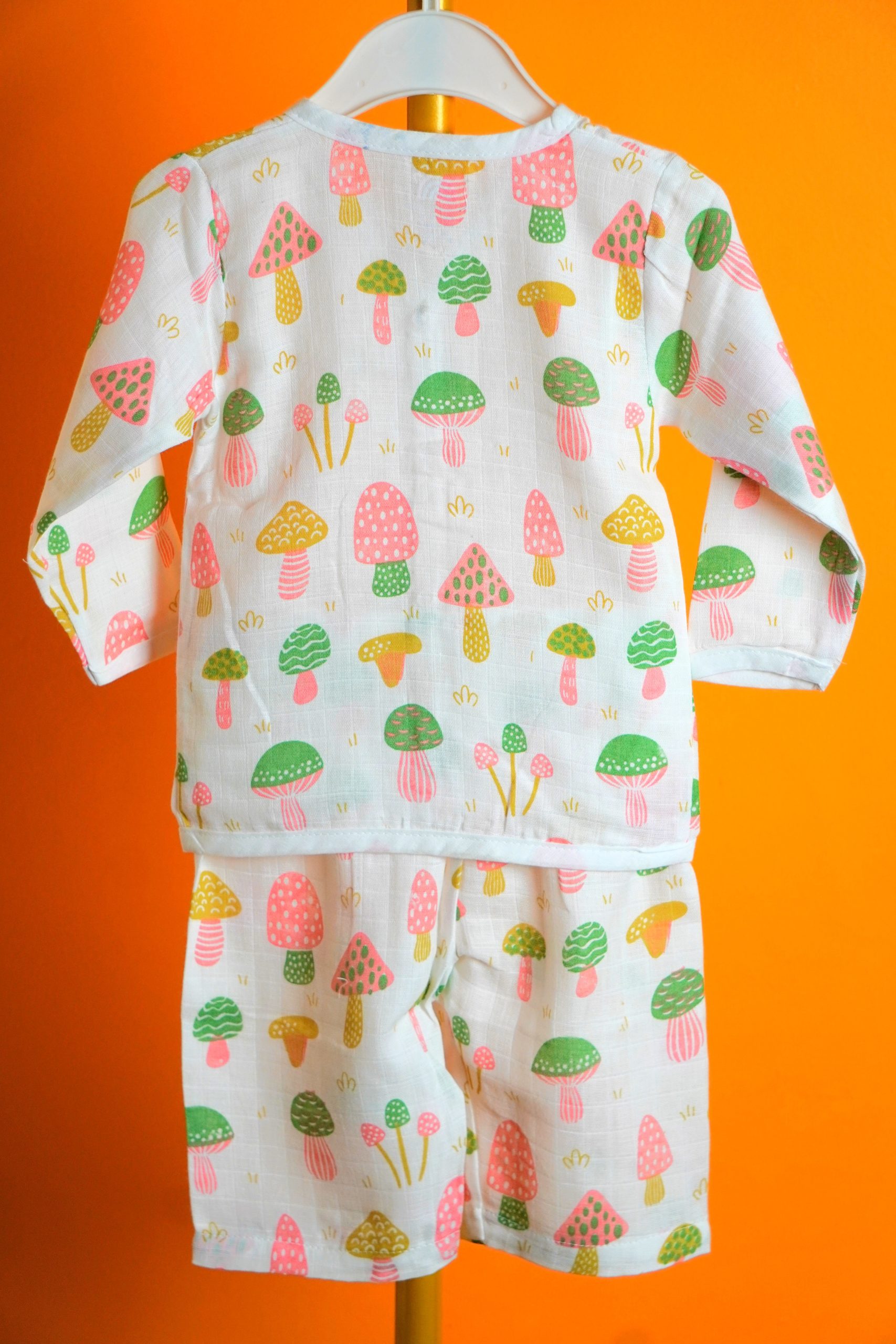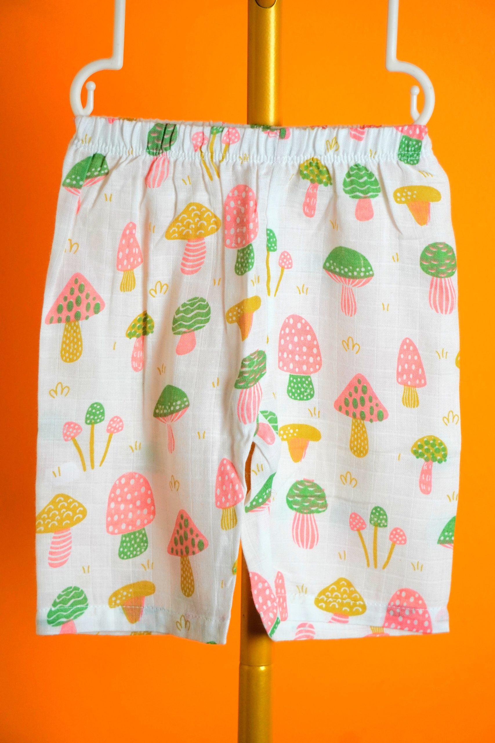 Let your little one step into a world of whimsy with this cheerful co-ord set, featuring a button-up V-neck shirt and comfy elastic-waist shorts. The crisp white base pops with a playful mushroom print in lively shades of green, pink, yellow, and orange—designed to spark joy and imagination.