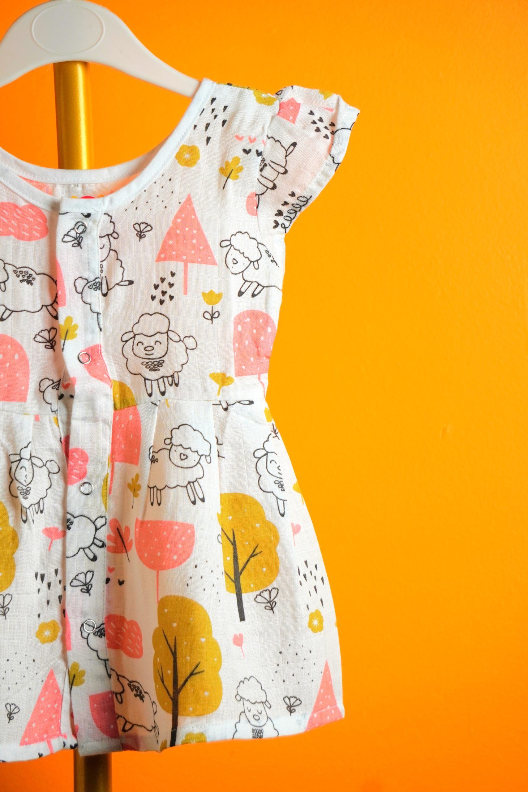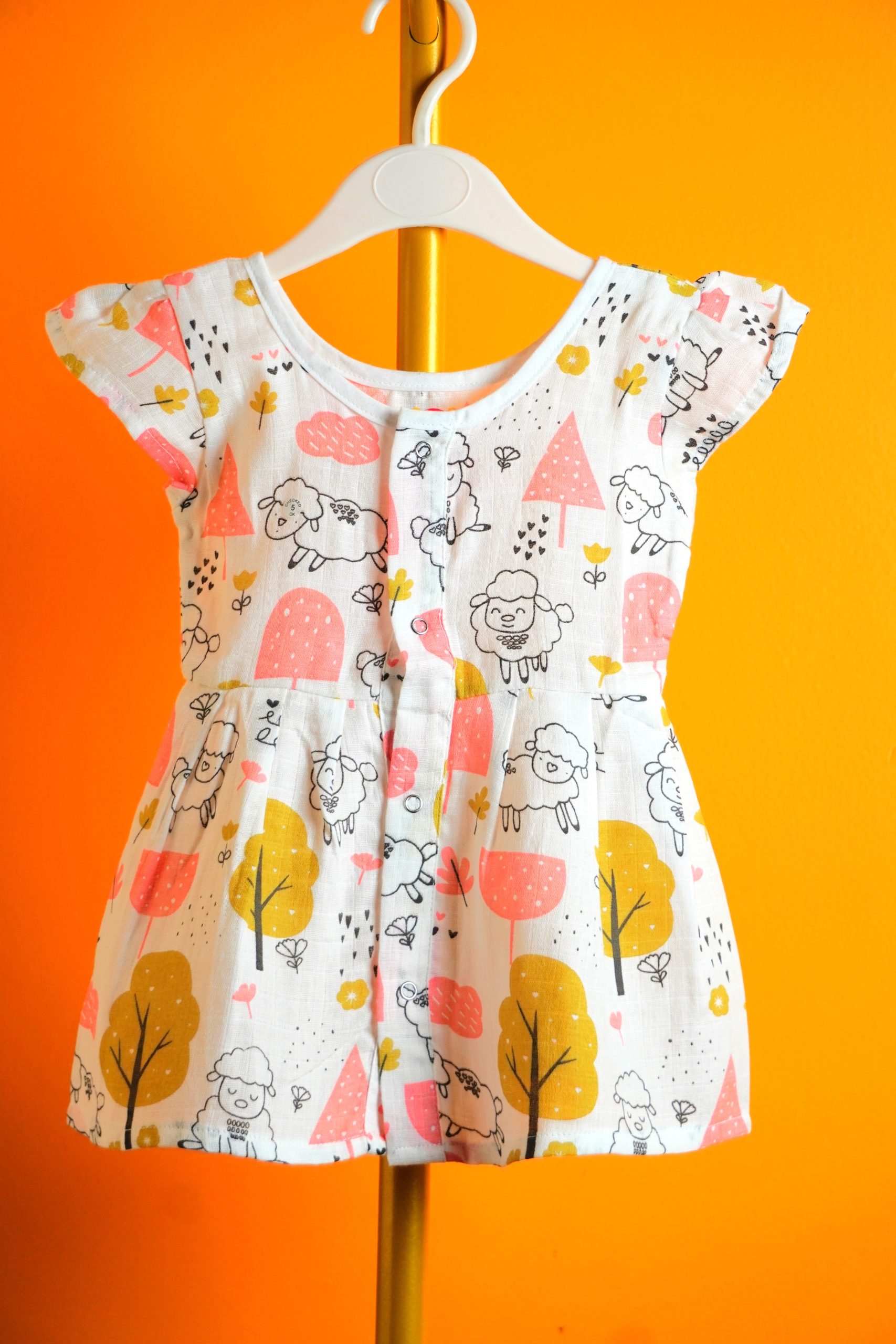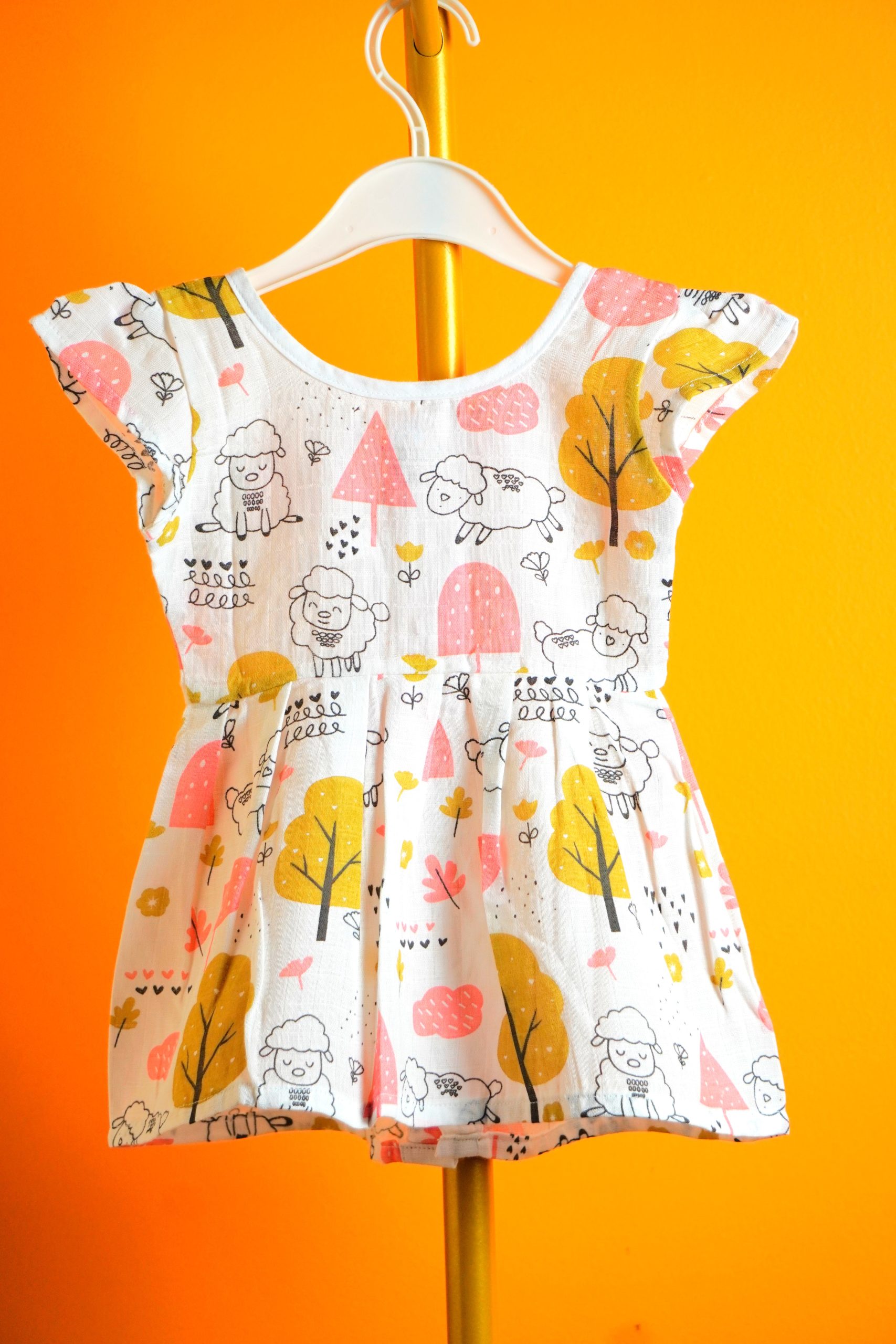 Let your little one twirl into a world of imagination with this delightfully illustrated dress. Featuring a joyful parade of cartoon sheep, raindrops, trees, and abstract shapes in pink, yellow, and black, this piece is a celebration of childhood wonder. The gathered waist and flared skirt add movement and charm, while the soft white base keeps it fresh and versatile.